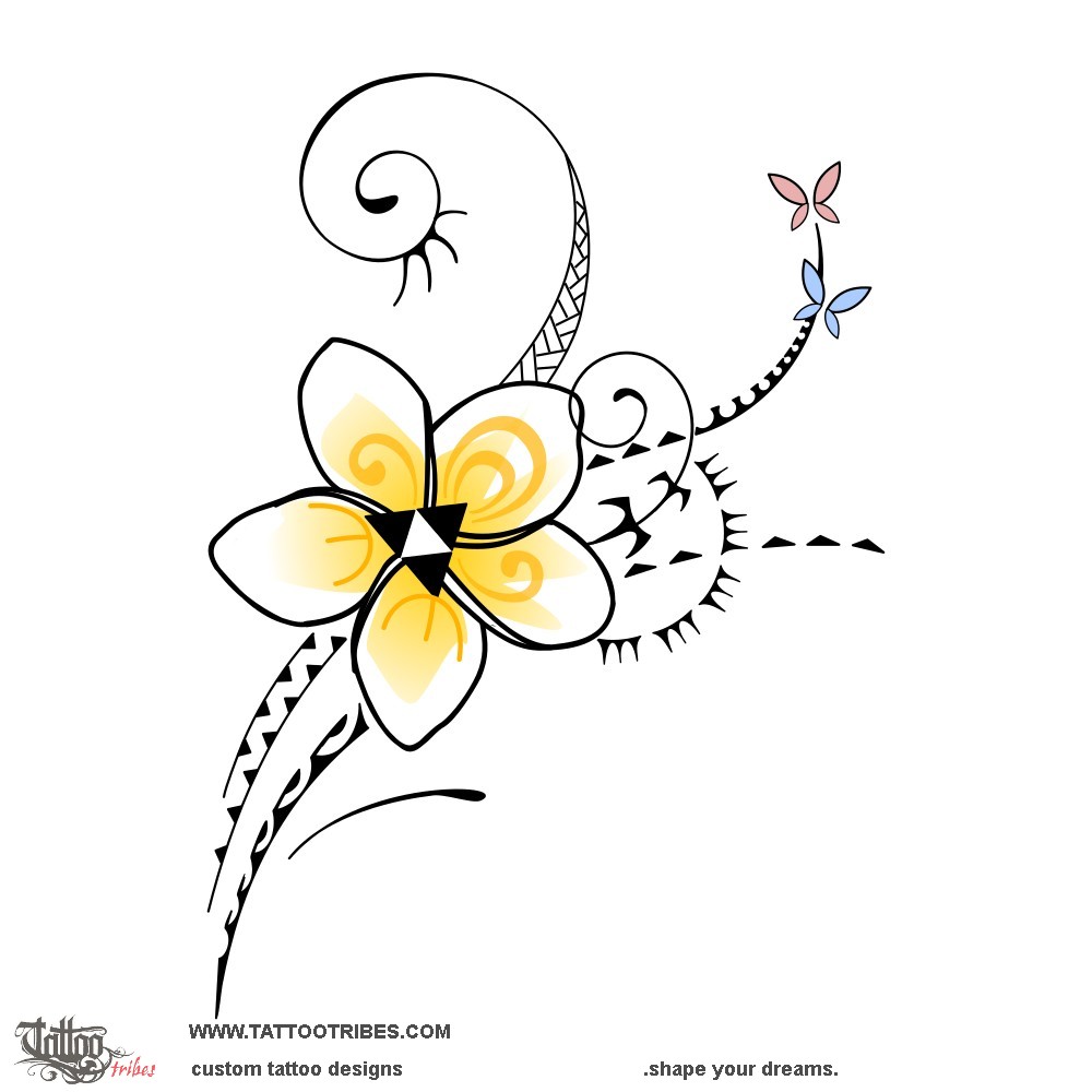 The frangipani flower represents her, and it has an ipu inside as a simbol of fertility (the mother) with two koru (her children) on its side and two tiki hands below them to show how she'll always protect them.