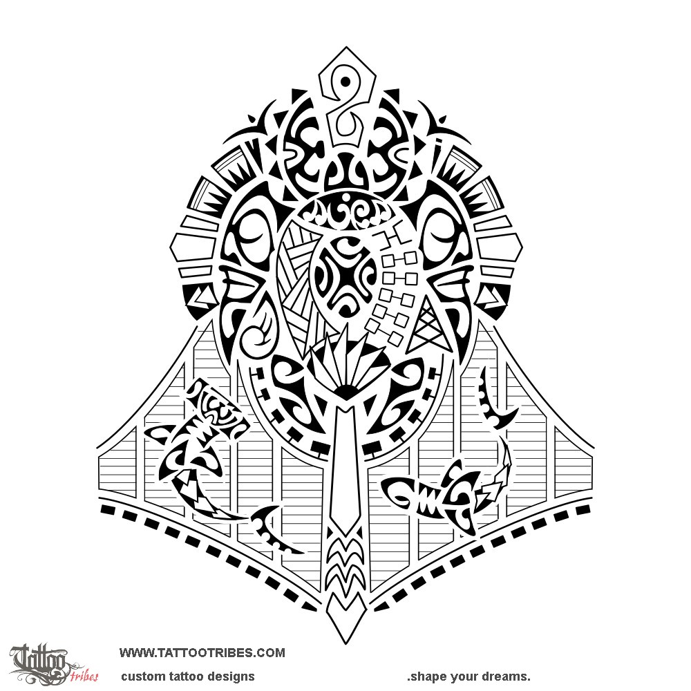 as a maorigram, with flax leaves for family union, and a Marquesan cross