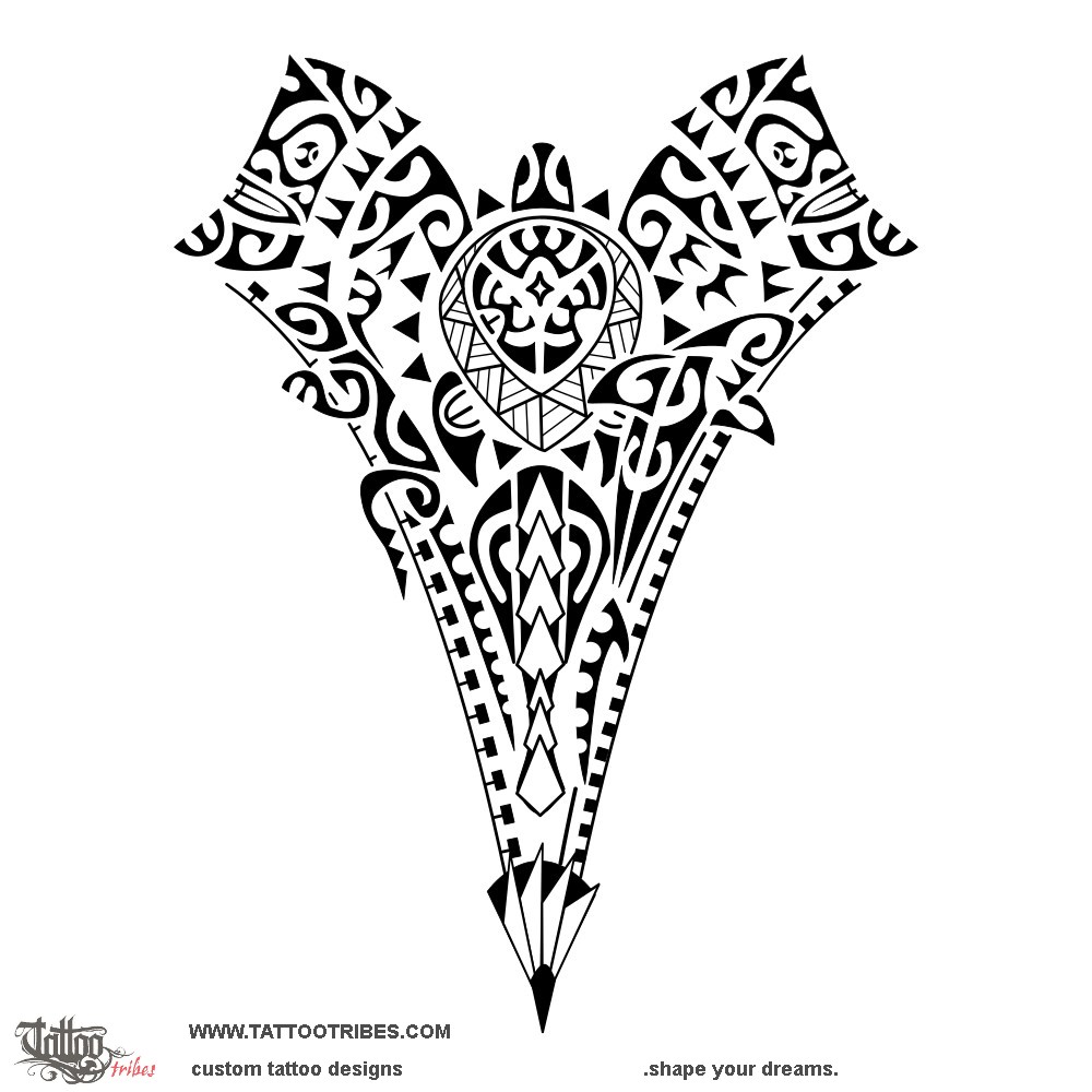 The upper parts are two tiki remaining on the sides of the turtle and knee for enhanced protection, while the mere below the turtle is a chiefly symbol that represents respect, loyalty, and leadership, and it symbolizes the values that he is teaching to his daughter.