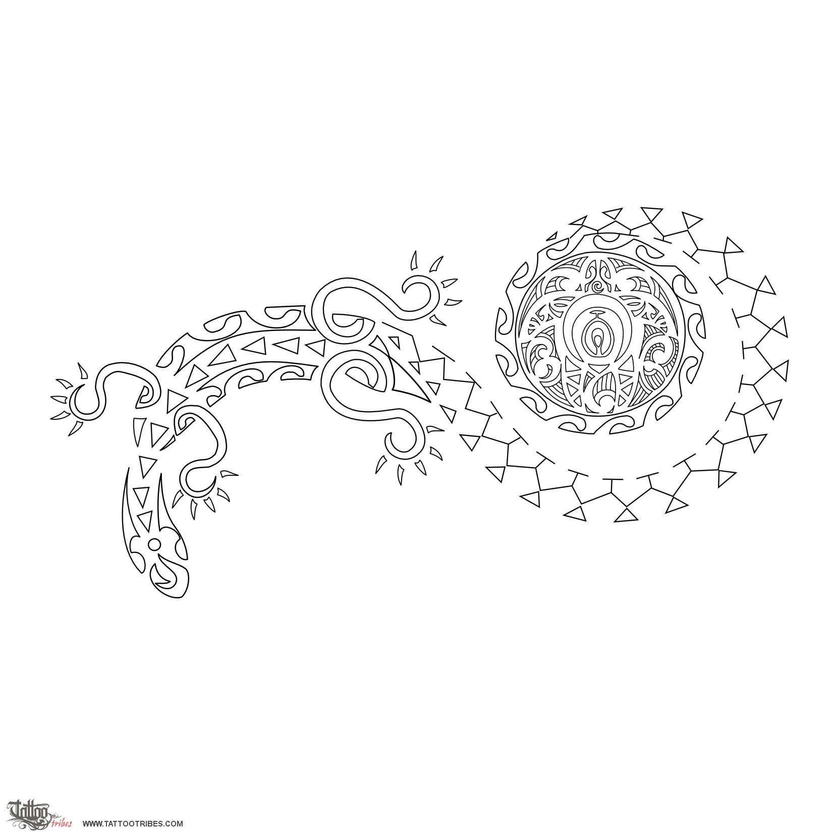 The sun represents eternity, life, and in its center the turtle symbolizes family. The front fins are formed by two tikis, to protect the family from every direction, and we placed two korus (new life) around the turtle and one in its head for the children, whose names starting letters, B, L and R, are placed below the tikis and between the back fins. "The all-seeing eye" forming the shell is a strong symbol of protection. The spiral motif of the turtle shell and shark teeth wants to symbolize a voyage for which much strength is needed. Waves mean change and the lizard (good luck) has the fish hook (abundance) and island symbols on its muzzle as a wish for finding a personal joyful island.
