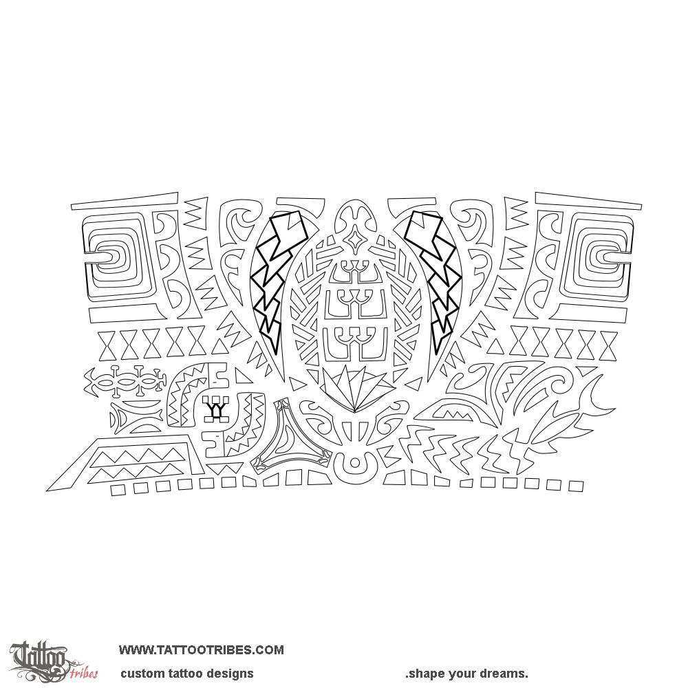 The two tiki protect the turtle, with his children represented on the shell and braid to symbolize their union giving him strength (spearheads on the front flippers).