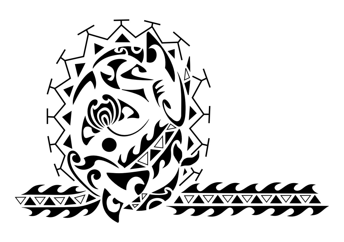We called tuakiri, that is personality, this tattoo requested by Alessio because it represents his character; waves forming the armband and the sun want to represent his life going on, with all the changes and events he comes across, and through his life two aspects of his personality alternate: the dolphin that symbolizes joy, friendship, games, and the shark that symbolizes strength and adaptability. The dolphin contains the shark teeth motif and the shark has a symbol of meeting inside because they are two sides of a single character and they can´t be separated. Romantic and strong, loving the sea and having company. The manta symbolizes elegance and freedom, the fish hook, or matau, is a symbol of wealth and the "all seeing eye" is a symbol of protection to scare enemies away.