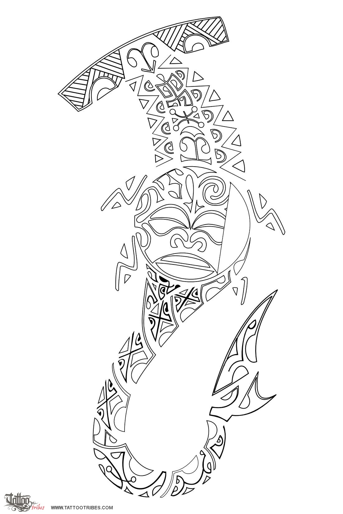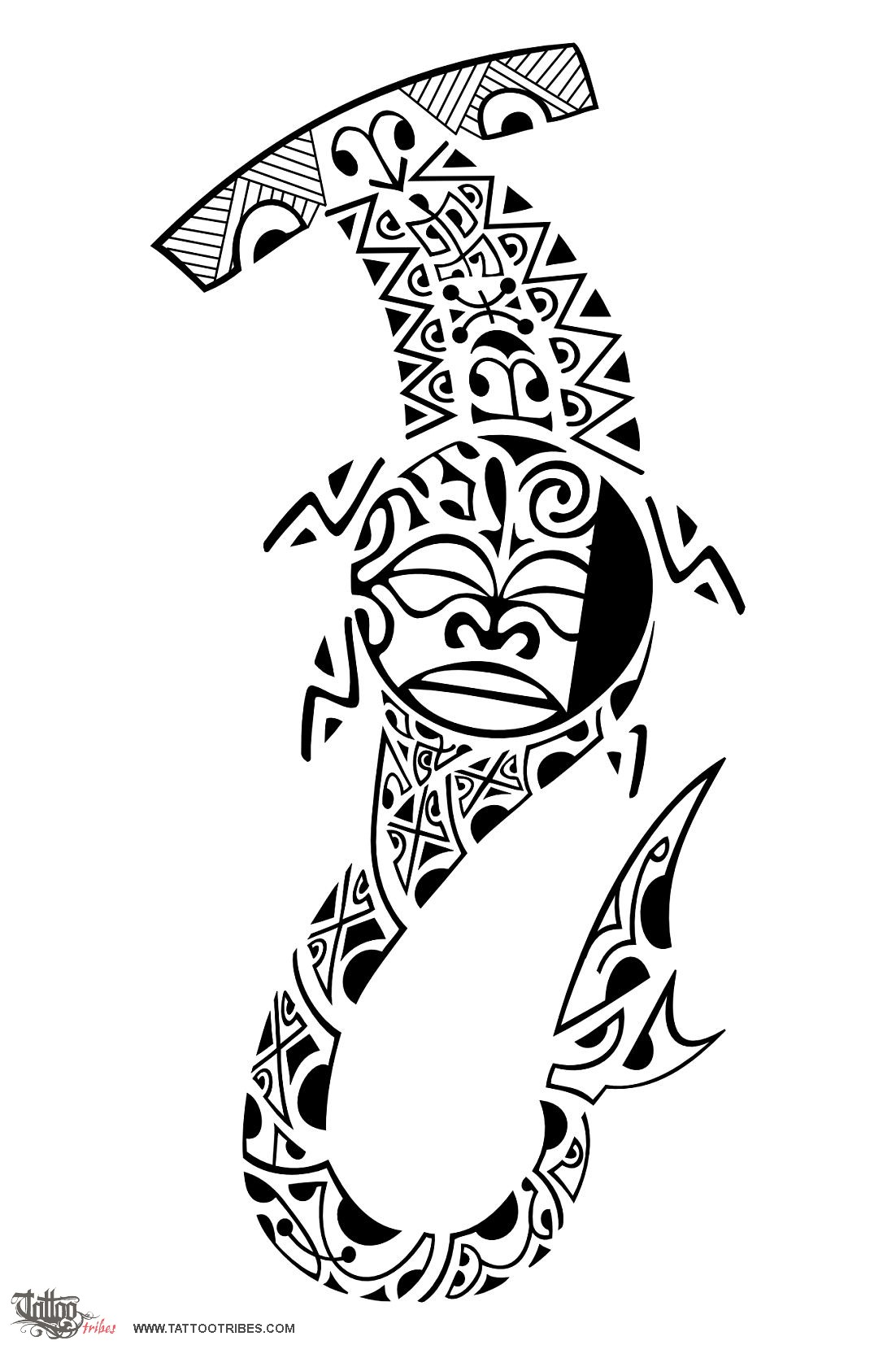 We were requested a Marquesan styled tattoo to represent inner strength and family protection, and to symbolize an accident which caused an ear to become deaf. The hammerhead shark represents strength and the tiki is a symbol of protection, included in this case into the shell of a turtle, representing a safe environment, family. The black area on the tiki represents the results of the accident.