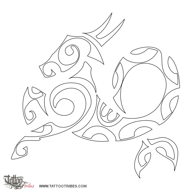 Capricorns are depicted with body and head of a goat and fish tail, representing their double nature, both creative and practical. In this drawing the waves are the main element symbolizing its mutability, with korus symbolizing life and new beginning.