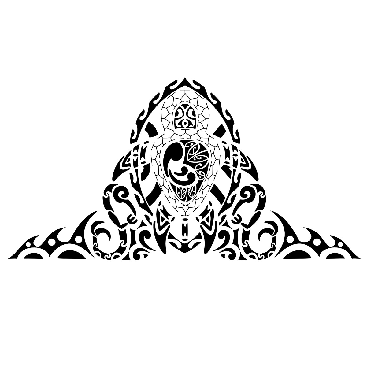 The turtle in this design represents the voyage, and the korus inside it, symbolizing a new beginning, were placed in order to shape a mother holding a child in her arms, paired with the traditional hammerhead shark pattern, which symbolizes strength and tenacity.